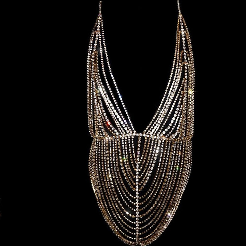 This Multilayer Chest Chain Dress is a striking and alluring ensemble that merges bold fashion with a touch of sensuality. It is designed for those who want to make a dramatic impact with their style. The chains add a dynamic and edgy element to the dress, making it perfect for individuals who appreciate avant-garde fashion.