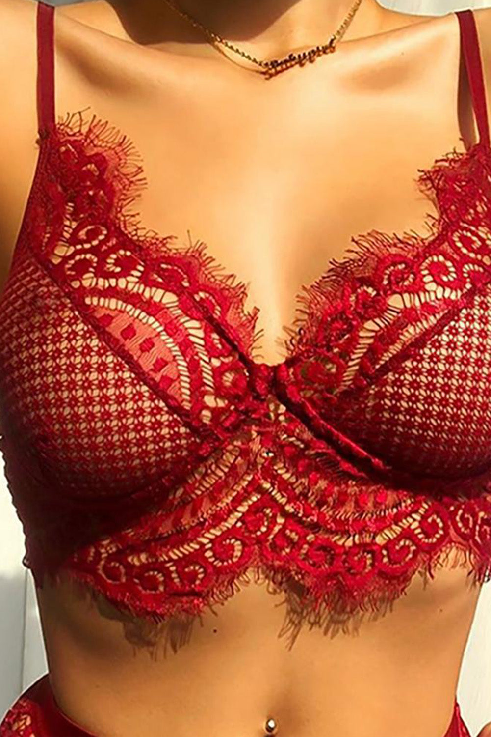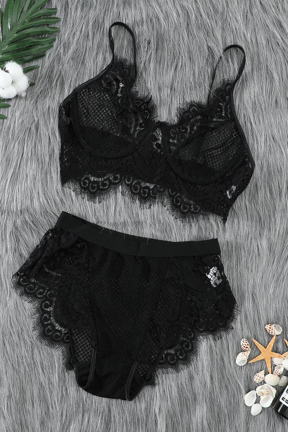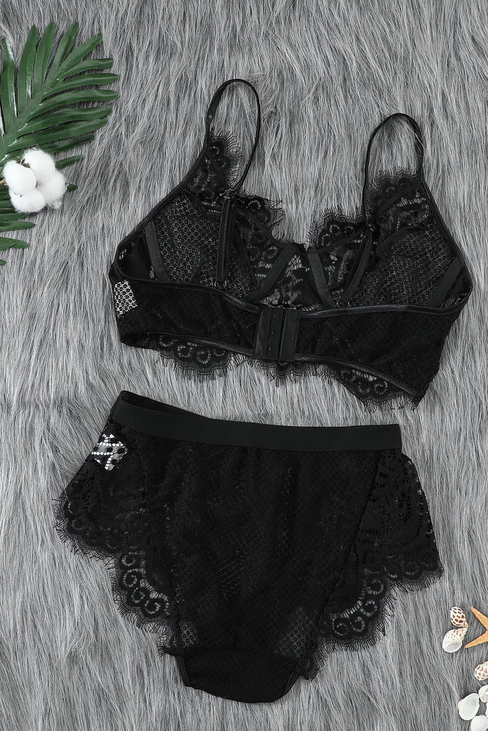 Embrace a stunning lacy style in this sultry lingerie set highlighted with eyelash trim. The top has a v-neckline and the bottom is high-waisted.