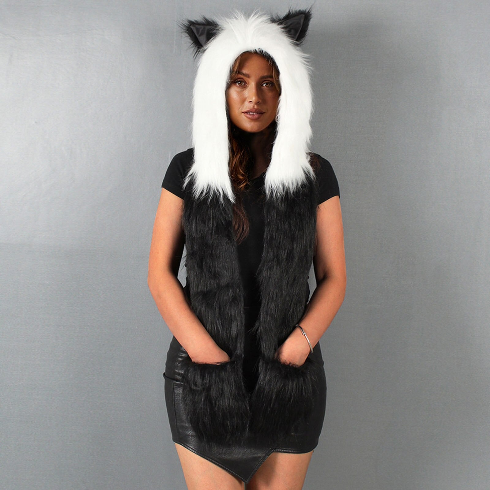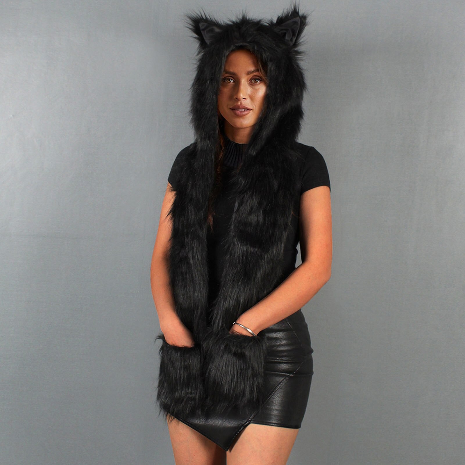 This Winter Faux Fur Hood Hat is a perfect blend of style, warmth, and luxury to elevate your winter wardrobe. This exquisite accessory is designed to make a statement while keeping you cozy in the coldest of temperatures. There are comfortable pockets cut on the paws of the animal, in which you can warm your hands.