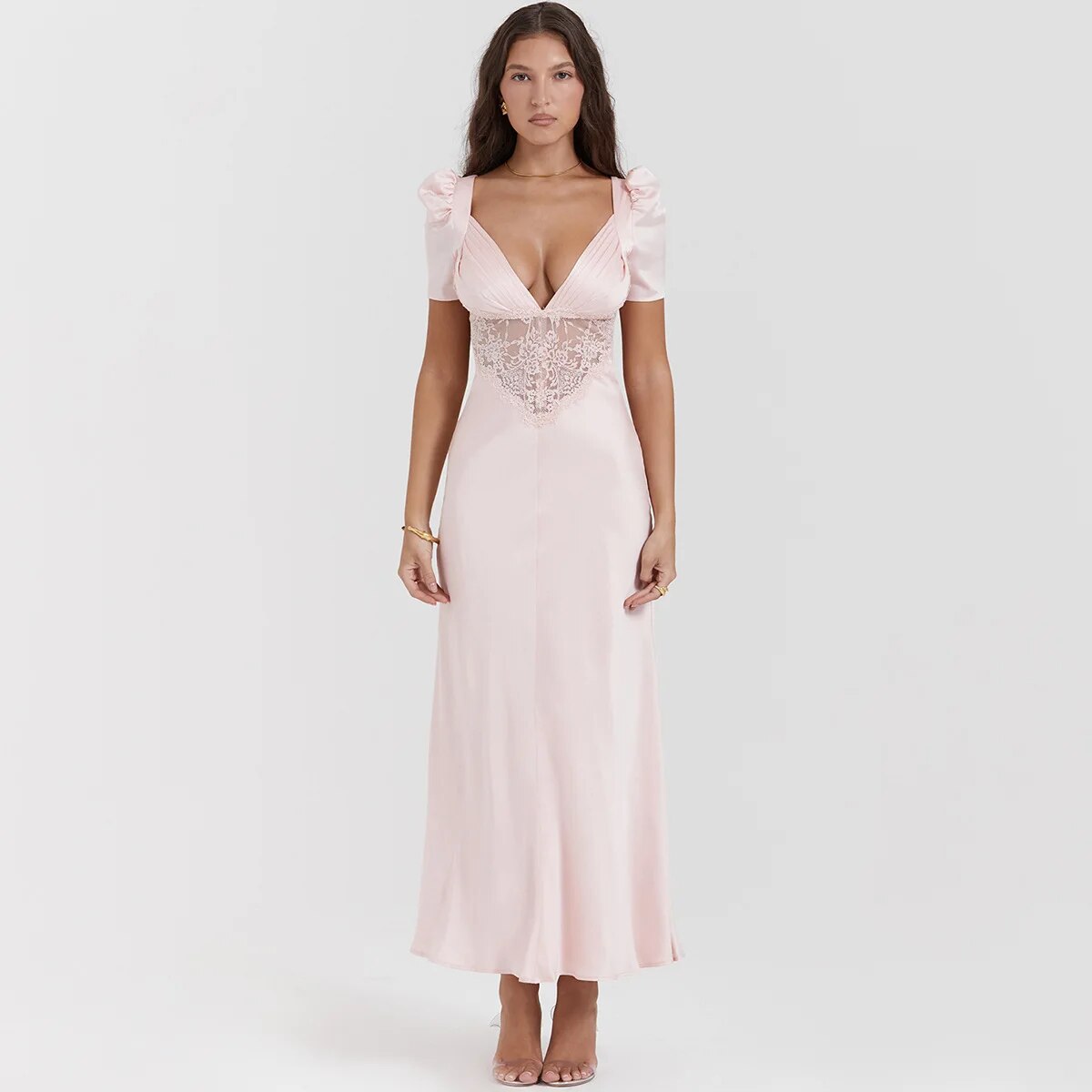 Women Short Sleeve Sexy Deep V Pink Satin Lace Waist Party Club Maxi Dress soft blue pure silk lace dress Pink holiday dress