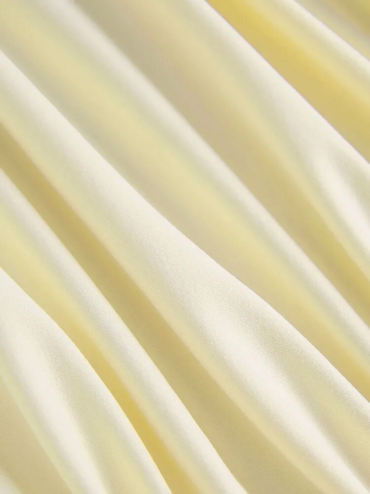 The intricate lace detailing on the bodice provides a luxurious touch, while the ruched satin skirt with a drawstring side slit allows for adjustable length and adds a playful twist. This midi dress is available in a radiant yellow that captures the joy of sunny days, and a serene light blue that reflects the tranquility of the sky.